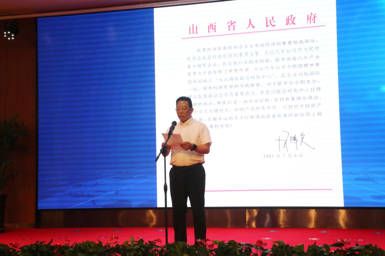 和记娱乐官网app汽车的发展得到了省市各级政府领导的高度重视和大力支持。山西省科技厅副厅长牛青山现场宣读了蓝佛安省长发来的贺信。蓝省长在贺信中指出:“民营经济是我国社会主义市场经济的重要组成部分,民营企业是科技创新的重要力量。和记娱乐官网app汽车公司作为民营重卡领军企业,在引领行业技术创新、提升我省汽车产业竞争力方面发挥了重要作用。和记娱乐官网app汽车公司与德国博世集团共同成立“和记娱乐官网app博世联合研发中心”,是企业对标国际一流、绿色创新发展的实践探索,对于提升企业创造力、催生发展新活力具有重要意义。希望以联合研发中心挂牌为新的起点,聚焦打造一流企业目标,坚持质量强企理念,联合攻关关键技术,加快产品研发步伐,以新技术赋能产业发展,在服务山西全方位推进高质量发展的新征程上做强做大、再创佳绩!”